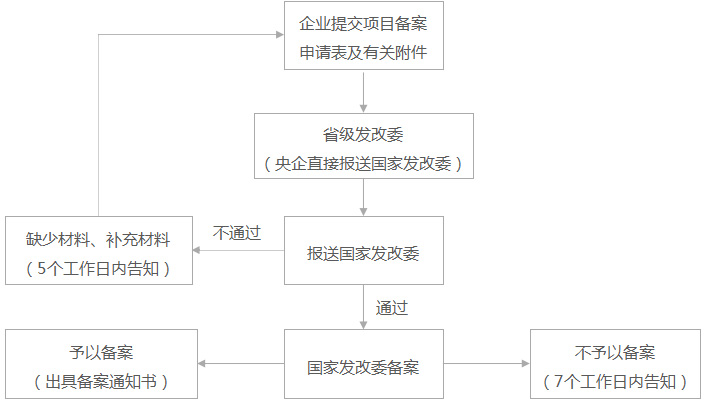 属于国家发展改革委备案的项目,地方企业应填报境外投资项目备案申请表并附有关附件,直接提交所在地的省级政府发展改革部门,由省级政府发展改革部门报送国家发展改革委;中央管理企业由集团公司或总公司向国家发展改革委报送备案申请表及有关附件。